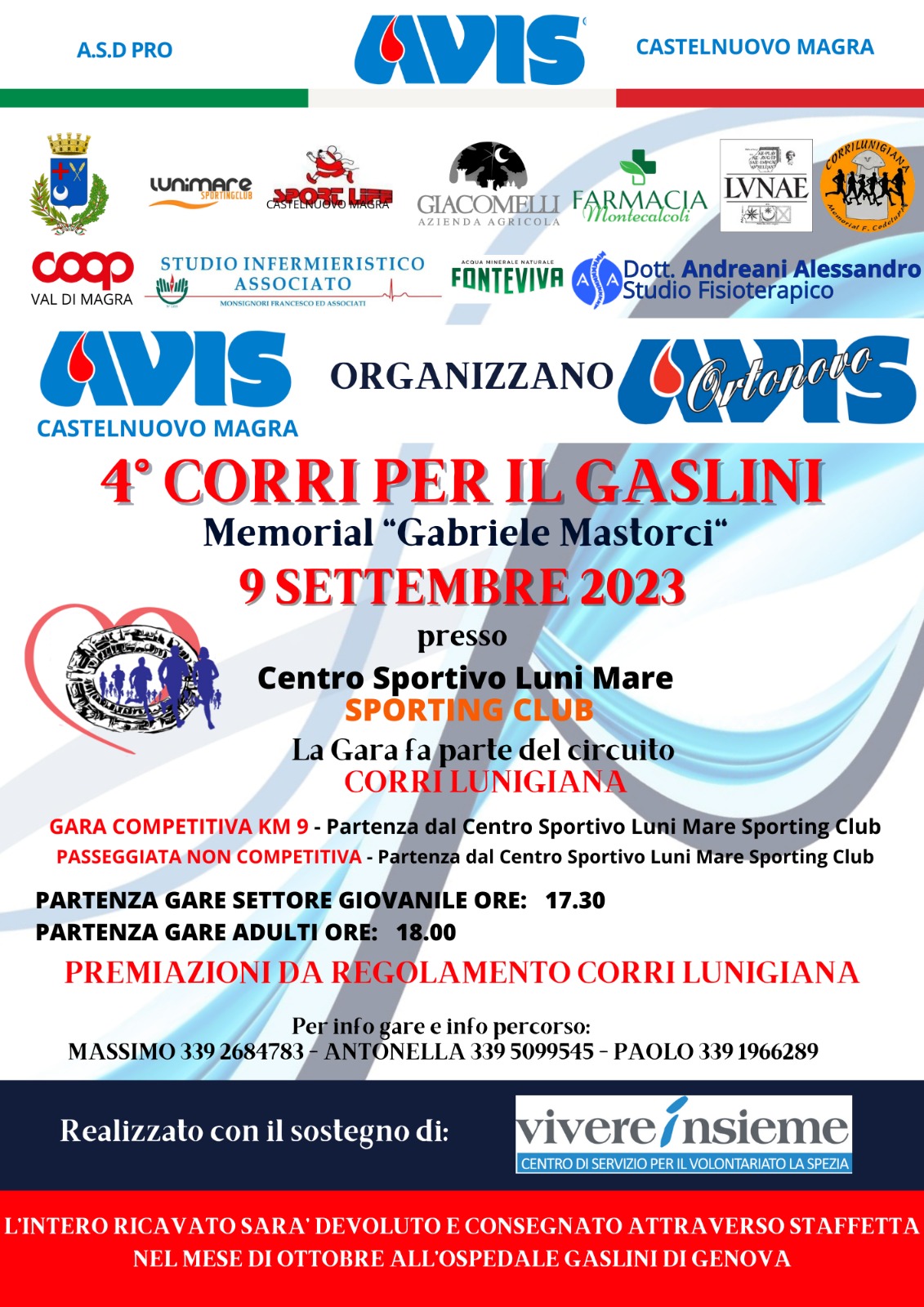 L'Associazione Sportiva Dilettantistica "Pro Avis Castelnuovo Magra" organizza in data 9 Settembre 2023 dalle ore 17.30 in località Luni Mare la corsa "Corri per il Gaslini" il cui ricavato sarà devoluto in beneficenza .