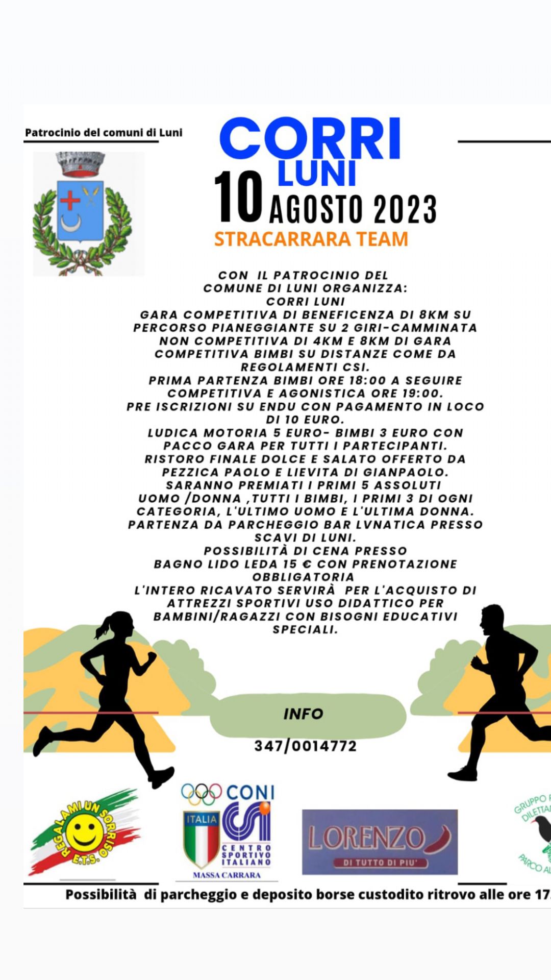 L' Associazione Sportiva Dilettantistica "Stracarrara Team" organizza in data 10 Agosto 2023 dalle ore 18.00 evento sportivo rivolto a bambini ed adulti in località Luni scavi. Il ricavato sarà devoluto in beneficenza.