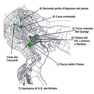 La Piazza di sopra, attraverso un piccolo arco, è collegata alla stretta via della scuola che è seguita poi da via Belvedere. Queste due vie costituiscono la strada mediana del borgo. L’andamento è a schiena d'asino e il rettifilo risulta in asse con la torre. Sulla via mediana, si affacciavano l’antica chiesa parrocchiale con annessa canonica, adibite da prima a palazzo comunale e successivamente a scuole elementari.