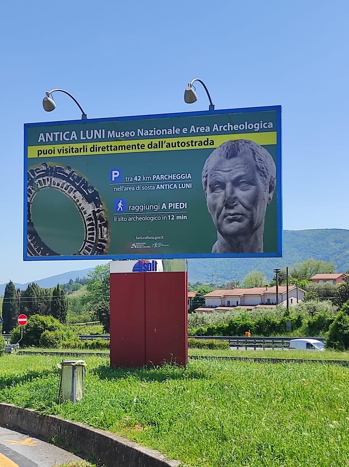 La promozione turistica del territorio di Luni continua grazie alle coperazioni attivate con la Direzione Musei della Liguria e la società SALT. Completato, infatti, il rinnovamento della segnaletica stradale per le aree di sosta “Antica Luni” lungo il tratto dell’A12, tra Sarzana e Carrara, le nuove indicazioni sui cartelli in uscita a Carrara, l’installazione di nuovi cartelloni pubblicitari in entrambe le carreggiate e nelle cinque aree di servizio nel tratto autostradale tra Liguria di Levante e Toscana (Brugnato ovest, Melara, Magra ovest, Monte Quiesa, Versilia est). Realizzatto anche un suggestivo video emozionale destinato ai locali food delle suddette autogrill.