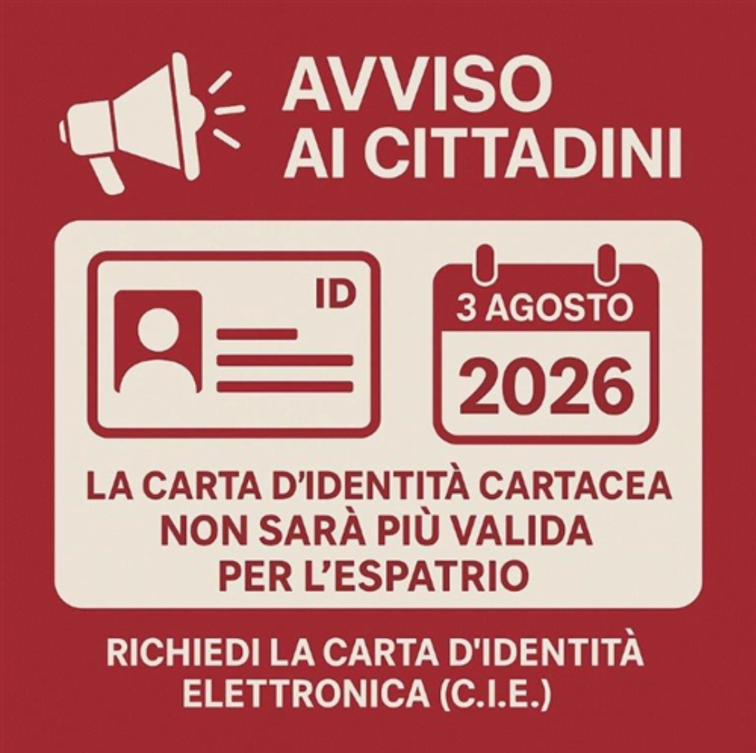 A parziale modifica di quanto già comunicato si informa che il dipartimento della funzione pubblica sentiti gli uffici competenti ha reso noto con circolare n 76 che la carta di identità cartacea a far data dal 03/08/2026 cesserà di essere valida anche all'interno degli stati membri dell'unione Europea.