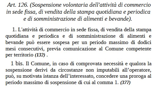 L'attività di commercio in sede fissa, di vendita della stampa quotidiana e periodica e di somministrazione di alimenti e bevande può essere sospesa per un periodo massimo di dodici mesi consecutivi, previa comunicazione al Comune competente per territori. Il Comune, in caso di comprovata necessità e qualora la sospensione derivi da circostanze non imputabili all’operatore, può, su motivata istanza dell’interessato, concedere una proroga al
