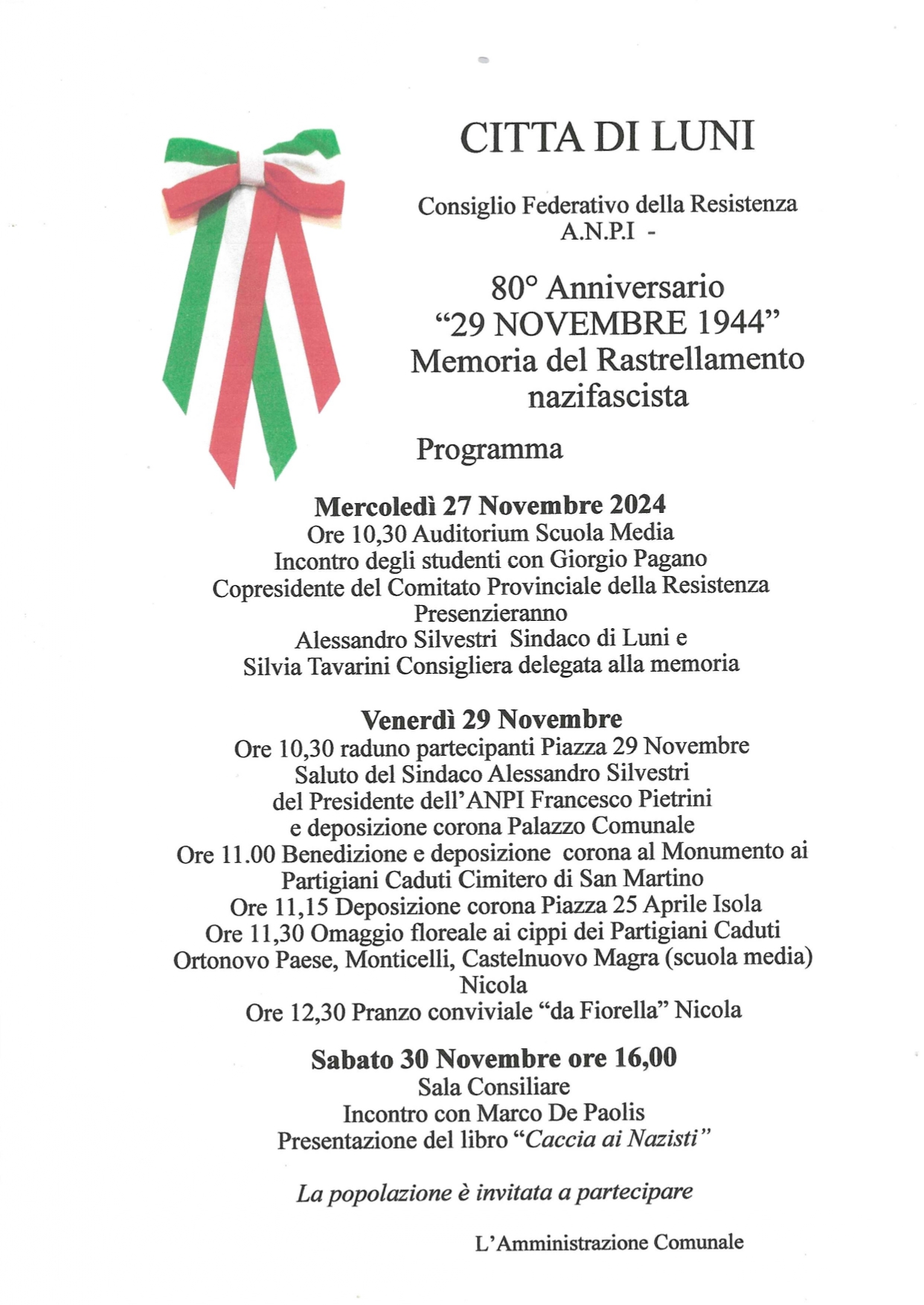 L' Amministrazione Comunale, il Consiglio Federativo della Resistenza e A.N.P.I. celebrano l'80° Anniversario del "29 Novembre 1944" data in cui le truppe nazifasciste avviarono una vasta operazione di rastrellamento che investì il territorio della Val di Magra e della Lunigiana.