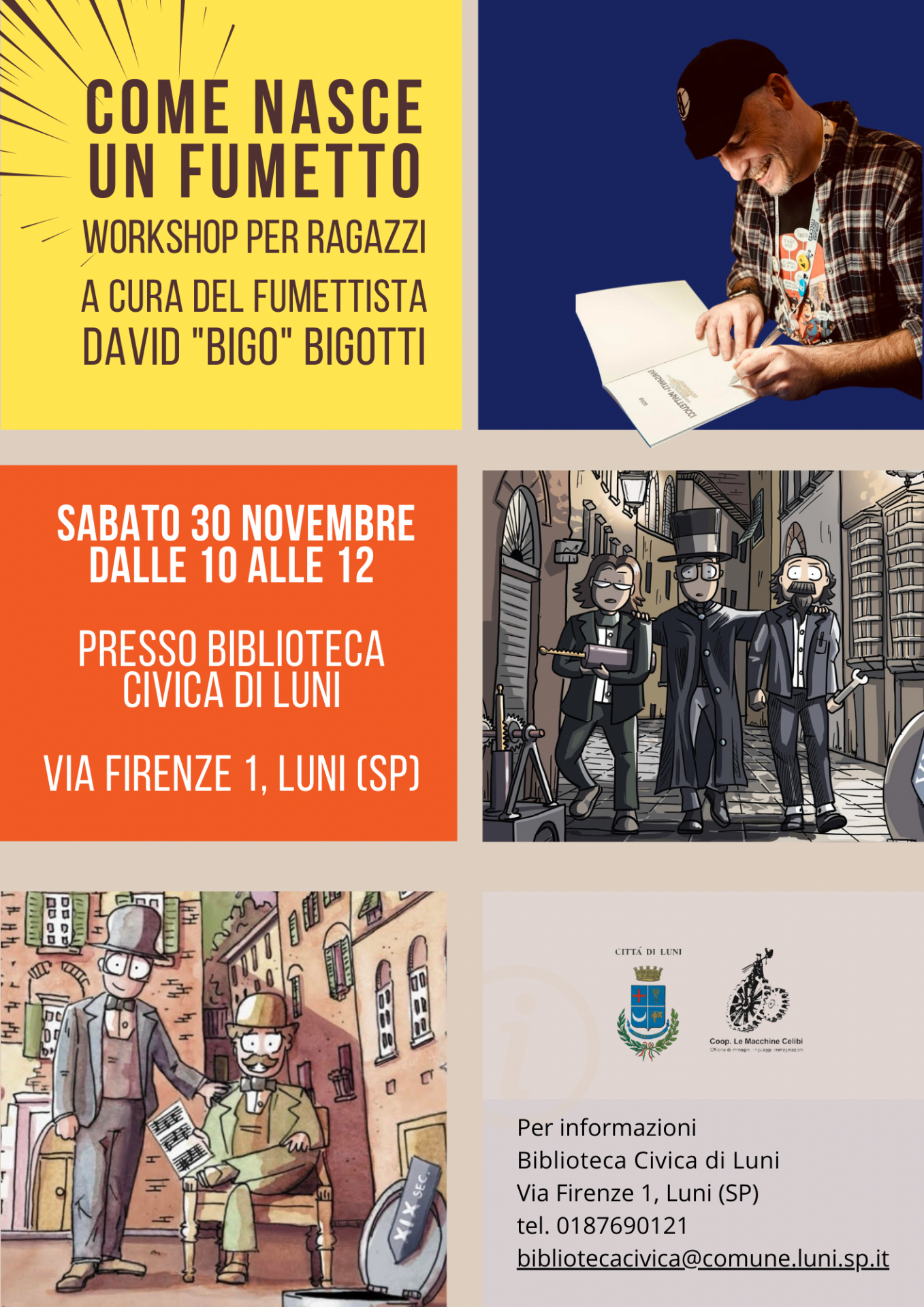 Sabato 30 Novembre c/o la Biblioteca Civica del Comune di Luni dalle ore 10.00 alle ore 12.00 workshop per ragazzi con il fumettista DAVID BIGOTTI che ci racconterà cosa è il fumetto, come è nato e come si è sviluppato illustrando le differenze tra la scuola europea, americana, giapponese.