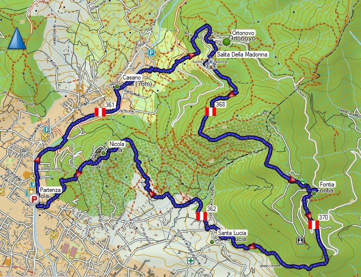 Itinerario: Isola di Ortonovo (25 m s.l.m) – Casano (60 m s.l.m) – Ortonovo (240 m s.l.m) – Fontia (350 m s.l.m) – Nicola (190 m s.l.m) – Isola di Ortonovo